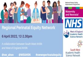 Join us for our fourth Regional South West & West of England Perinatal Equity Network, in response to the growing commitment in the region to work together to address inequality within maternity and neonatal services. This invitation is open to all working within maternity and newborn services, related organisations or with a responsibility or interest in reducing inequalities in the NHS. We warmly welcome parents or patient partners to join us.