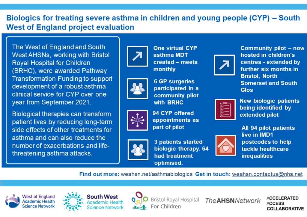Since September 2021, the West of England and South West AHSNs and Bristol Royal Hospital for Children have also supported a paediatric asthma project to improve care pathways and access to biologic therapies for children and young people. View our summary infographic for key project outcomes:
