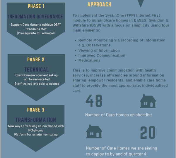 Bath Swindon & Wiltshire (BSW) Integrated Care System piloted the use of TPP’s SystmOne online module in care homes. This is the system used by the vast majority of GP practices. Early feedback from this pilot (and another in East Midlands) shows demonstrable benefits through the accessing of up-to-date clinical information on each resident and easier direct communication with GPs. Gloucestershire’s Integrated Care System is also moving ahead with implementation as ‘fast followers’ behind BSW.