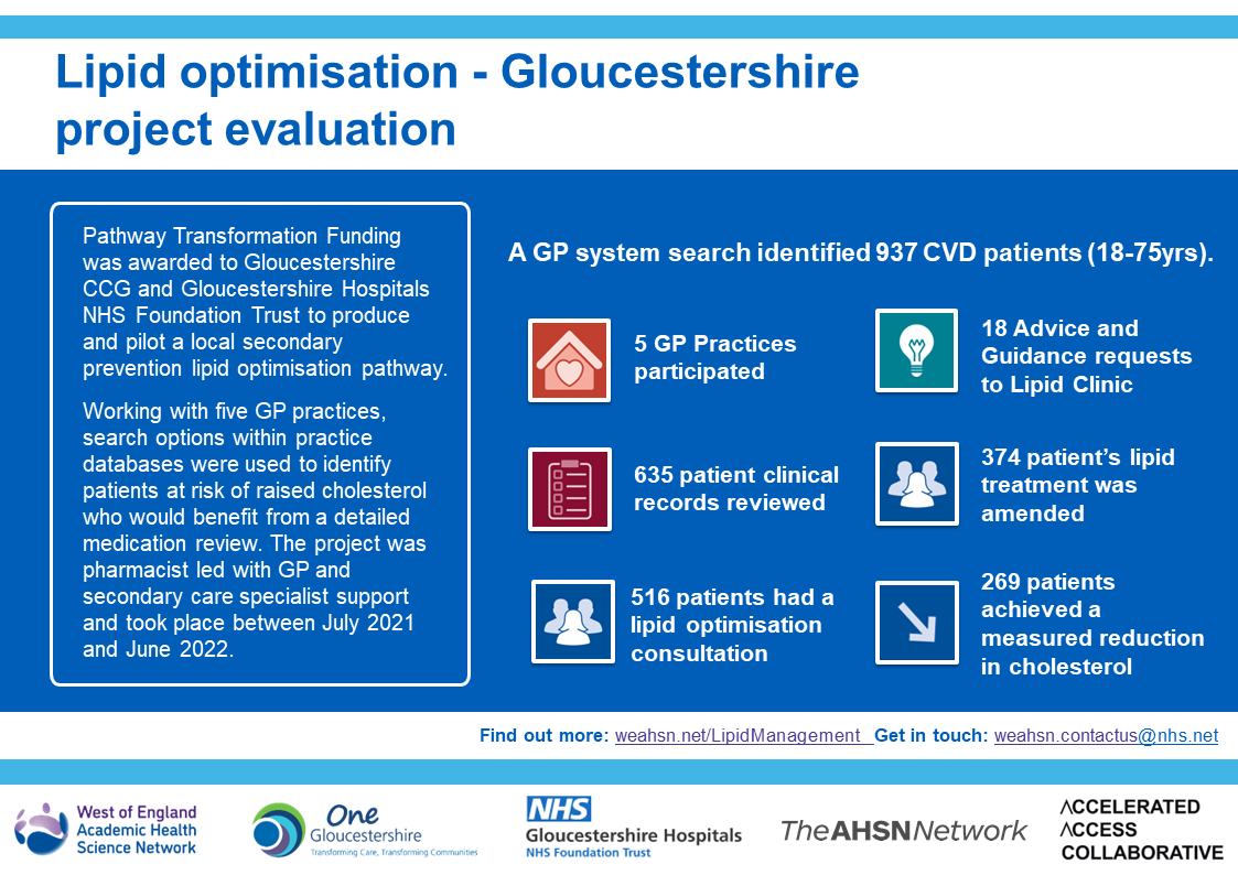 Following receipt of Pathway Transformation Funding in 2021, we worked with five GP practices across One Gloucestershire using search options within practice databases to identify patients at risk of raised cholesterol who would benefit from a detailed medication review: