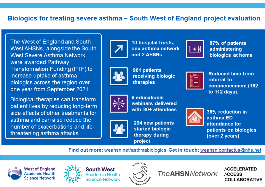 Following a successful bid in April 2021 to the Pathway Transformation Fund, Health Innovation South West and Health Innovation West of England were awarded £129,000 funding for two projects focused on the treatment of severe asthma. We worked alongside the South West Severe Asthma Network and 10 acute trusts on a project focused on adults. In a separate project, we also worked with Bristol Royal Hospital for Children to improve access to asthma biologics for children. Read about the project successes and learning here.